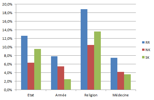 Les admins l'ont bien dit, les voies mineures (armée et médecine), c'est bien, mais si trop de monde les choisit, la concurrence sera d'autant plus forte pour le passage au niveau 4. Et ils ne se sont pas trompés. Le pourcentage de personnages passés au niveau 4 est bien plus élevé pour les voies de l'Etat et la Religion. Si pour la médecine, on peut l'expliquer par le fait que rien n'était encore codé, ce n'est pas le cas de la voie de l'armée. Distribuer des points aux armées est beaucoup plus rare que donner des points à sa province ou son village, et la proportion moindre d'érudits militaires ne compense pas cela.