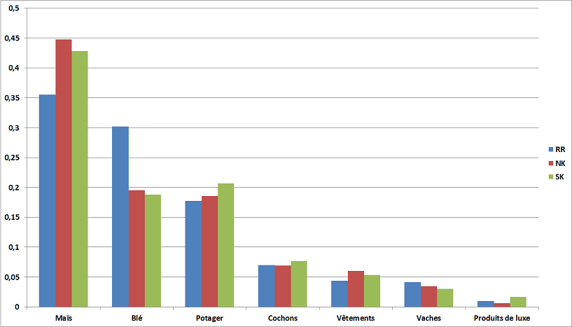 1) Les moutons (RR) produisent à la fois des peaux et de la laine, ils sont donc comparés à l'addition des deux types de champs, pour NK et SK, produisant leurs équivalents. Ils sont regroupés dans la catégorie "vêtements".
