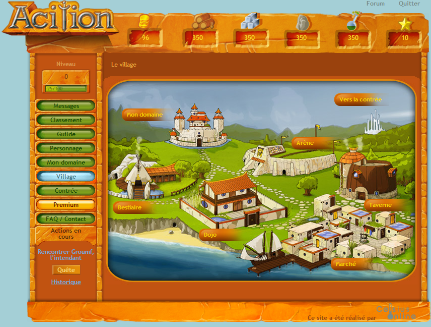 En observant l'interface créé, on peut constater que l'écran principal est inspiré de celui des Royaumes Renaissants et représente un village avec différents lieux (taverne, marché, dojo, arène, etc.)